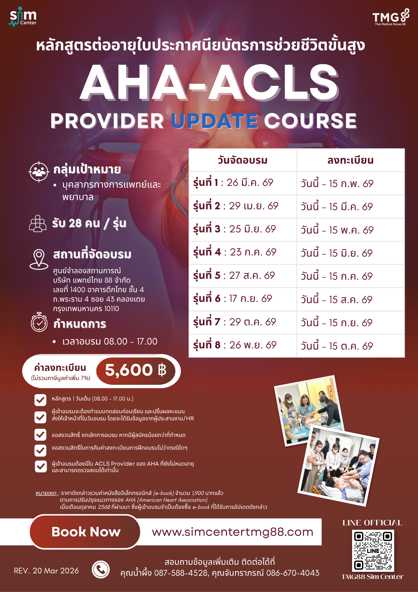 - ราคาดังกล่าวรวมค่าหนังสืออิเล็กทรอนิกส์ (e-book) จำนวน 1,600 บาทแล้ว ตามการปรับปรุงแนวทางของ AHA (American Heart Association) เมื่อเดือนตุลาคม 2568 ที่ผ่านมา ซึ่งผู้เข้าอบรมจำเป็นต้องซื้อ e-book ที่ได้รับการอัปเดตดังกล่าว