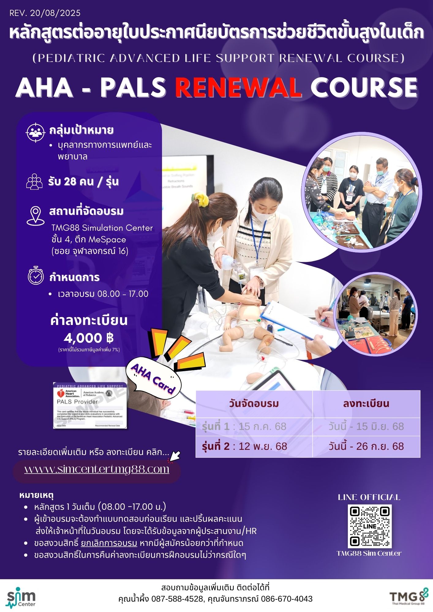 - ผู้เข้าอบรมหลักสูตรนี้ต้องมีใบ PALS Provider ของ AHA ที่ยังไม่หมดอายุในเดือนที่อบรมและสามารถตรวจสอบได้